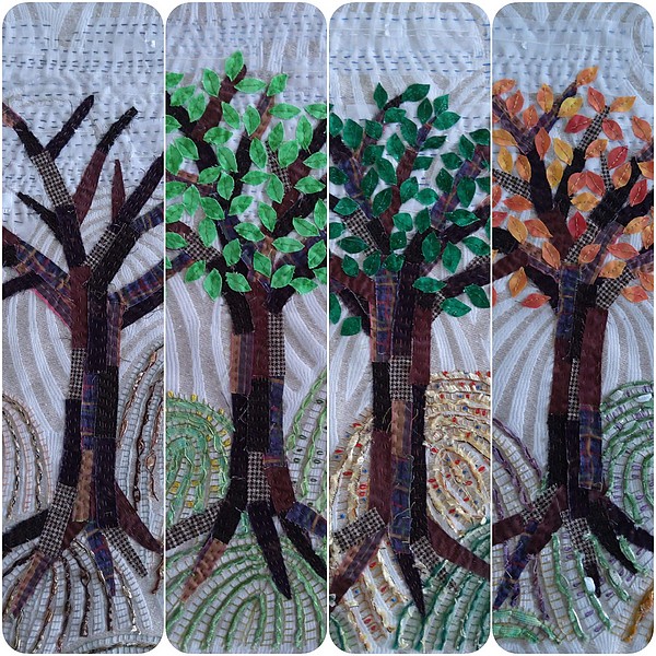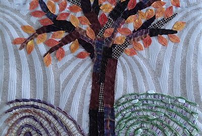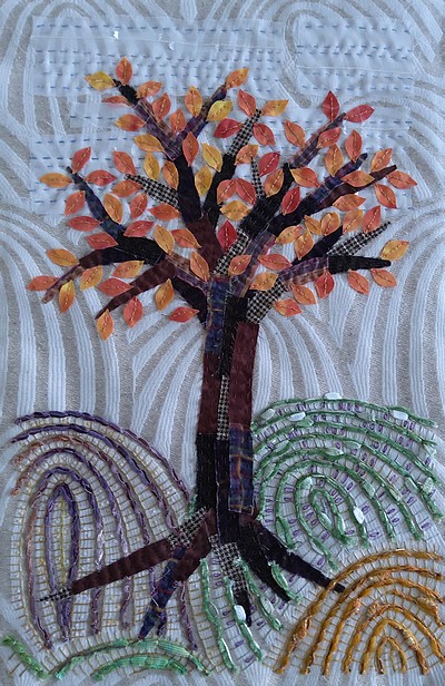 « Un arbre, en automne » est le dernier de la série « un arbre, quatre saisons ». Commencée en 2024, elle se termine. Même taille, même tissu de fond, même forme d’arbre, seules les couleurs changent.