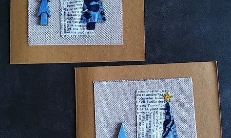 Sur un tissu de fond en lin écru , j’ai cousu  un rectangle avec un texte imprimé, un triangle de batik bleu et une étoile. J’ai ajouté un joli sapin en bois. J’ai collé le tout sur une carte couleur kraft.